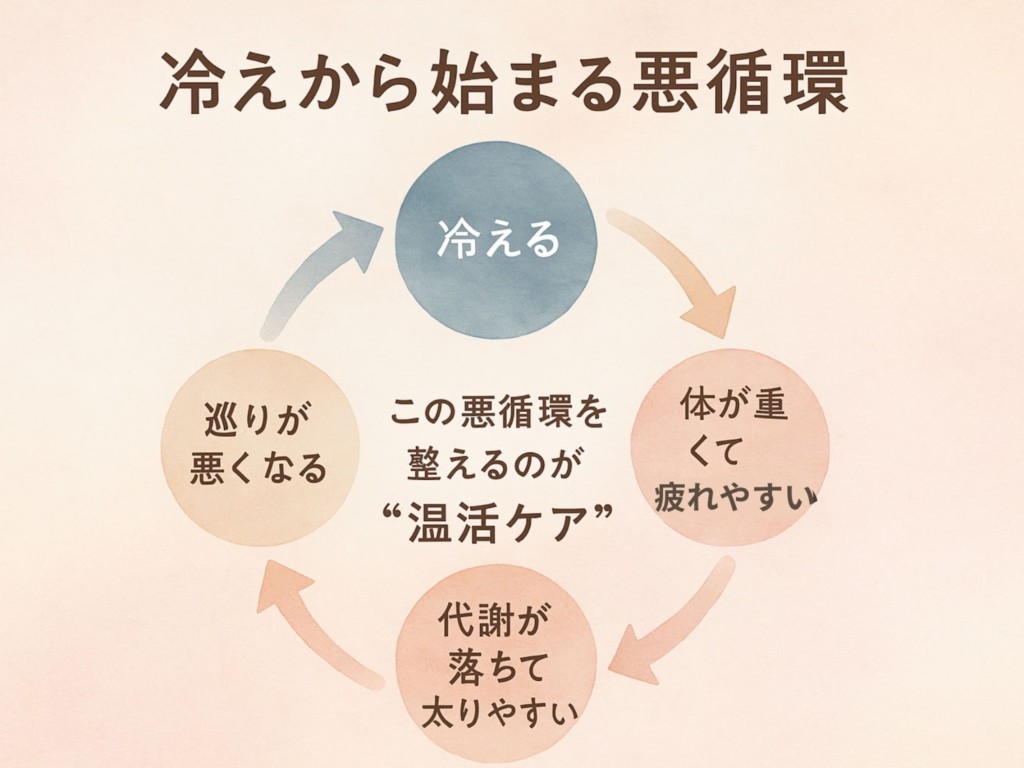 身体の“冷え”と“巡りの低下” が、代謝を落とし、脂肪が燃えにくい体へ変えてしまうのです❄️